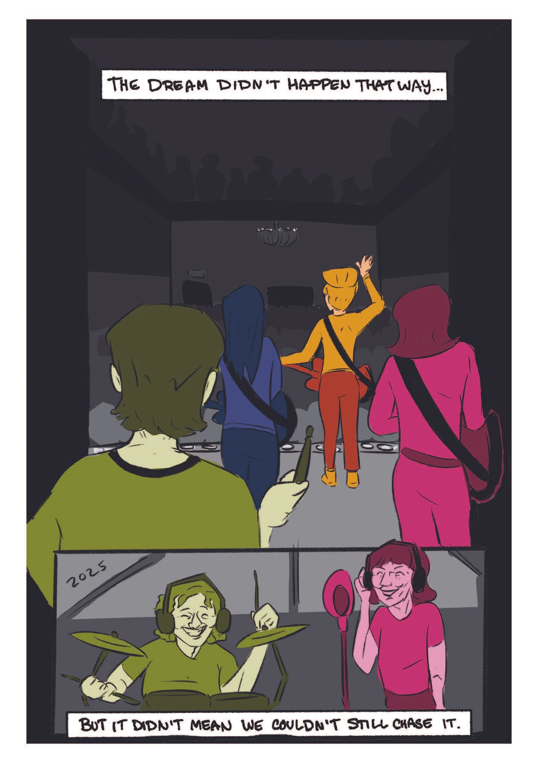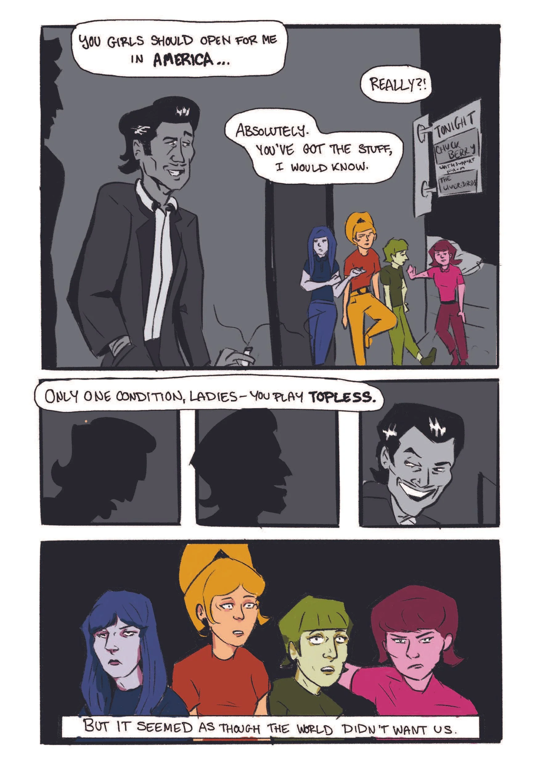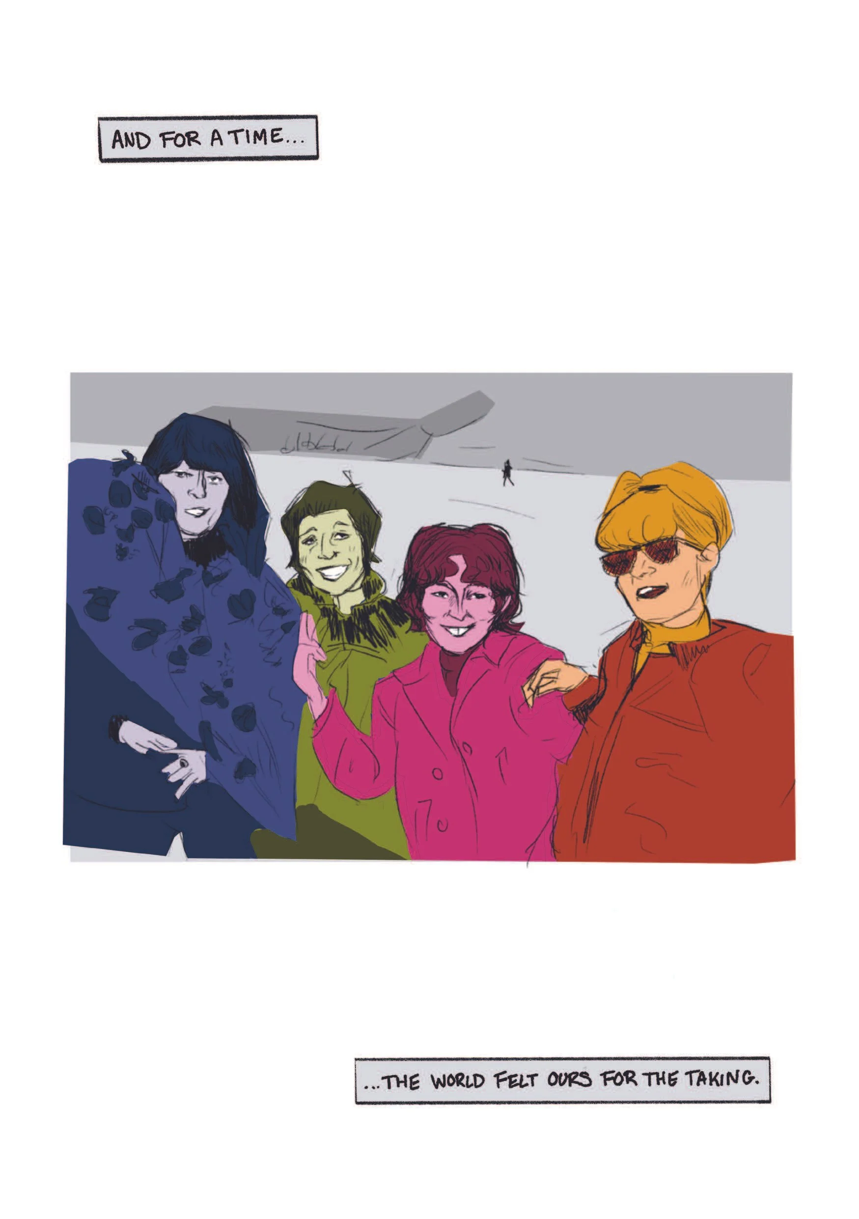 GIRLS DON’T PLAY GUITAR is a short-form graphic novella depicting the story of the Liverbirds, the real-life all-girl rock band formed in 1960s Liverpool in the wake of Beatlemania. The work takes inspiration from DIY music zines and other music-focused graphic novels, telling the story of the band from its inception to its premature end and highlighting the many societal factors poised against the girls and the impact of their gender on their careers. The illustrations are drawn digitally using Procreate and InDesign, and the novella exists primarily as a printed zine, with a digital version available for ease of distribution.